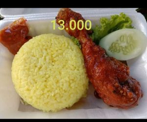 Nasi Kuning - Ayam Goreng - Perkedel Kentang - Sambal Goreng Kentang - Bakmie Goreng - Kering Tempe - Serundeng - Timun - Kerupuk